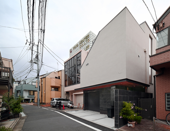 都会のなかでリゾート気分を味わえる家というのが、最初からひとつのテーマとしてありました。それに沿って空間構成や外部への閉じ具合、壁の高さ、素材感などを詰めていきました。来客頻度の多いご家族で、プライベートとパブリックなゾーンをまず階層で区分けし、ホール脇にある幅広の階段を上がり、奥行きのあるリビングへと導きます。リビングは間延びしないように床や天井に段差を付け柔らかく分節し、その延長には南に面したテラスがあり、吹抜けの高窓と共に、自然光をふんだんに室内へ取り込みます。また外部は屋上にもあり、気候の良い日は屋上でゆったり時間を過ごせるように設備も設え、金属防水を施しリスクの低減も図っています。室内外を問わず、その日の気分でリラックスできる場所があちこちに点在する家となりました。家へ帰ると都会の喧騒をひととき忘れられるような、日々のせわしない生活のなかにちょっとだけ潤いや楽しさを感じられる、、そんな家となったらうれいいです。