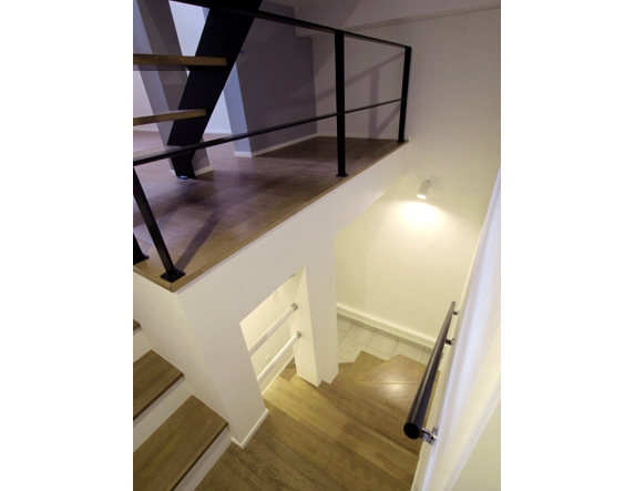 | 周囲は高い建物に囲まれた間口の限られた立地での計画において、奥と手前のボリュームを半階ずらし半地下から3階までのフロアをめいっぱい使えるようにスキップフロア方式を取り入れ計画しました。空間を分節する階段はスケルトンタイプを採用し光井戸として機能させ階段越しに上から光が各フロアに降り注ぐように考えました。同時に手前と奥の空間を遮らないように、しかしフロアがずれているので立体的に柔らかく分節して建物全体をつなぎます。高さ方向に強弱を与えることで坪数だけでは表せない豊かな空間になるかと思っています。 |
